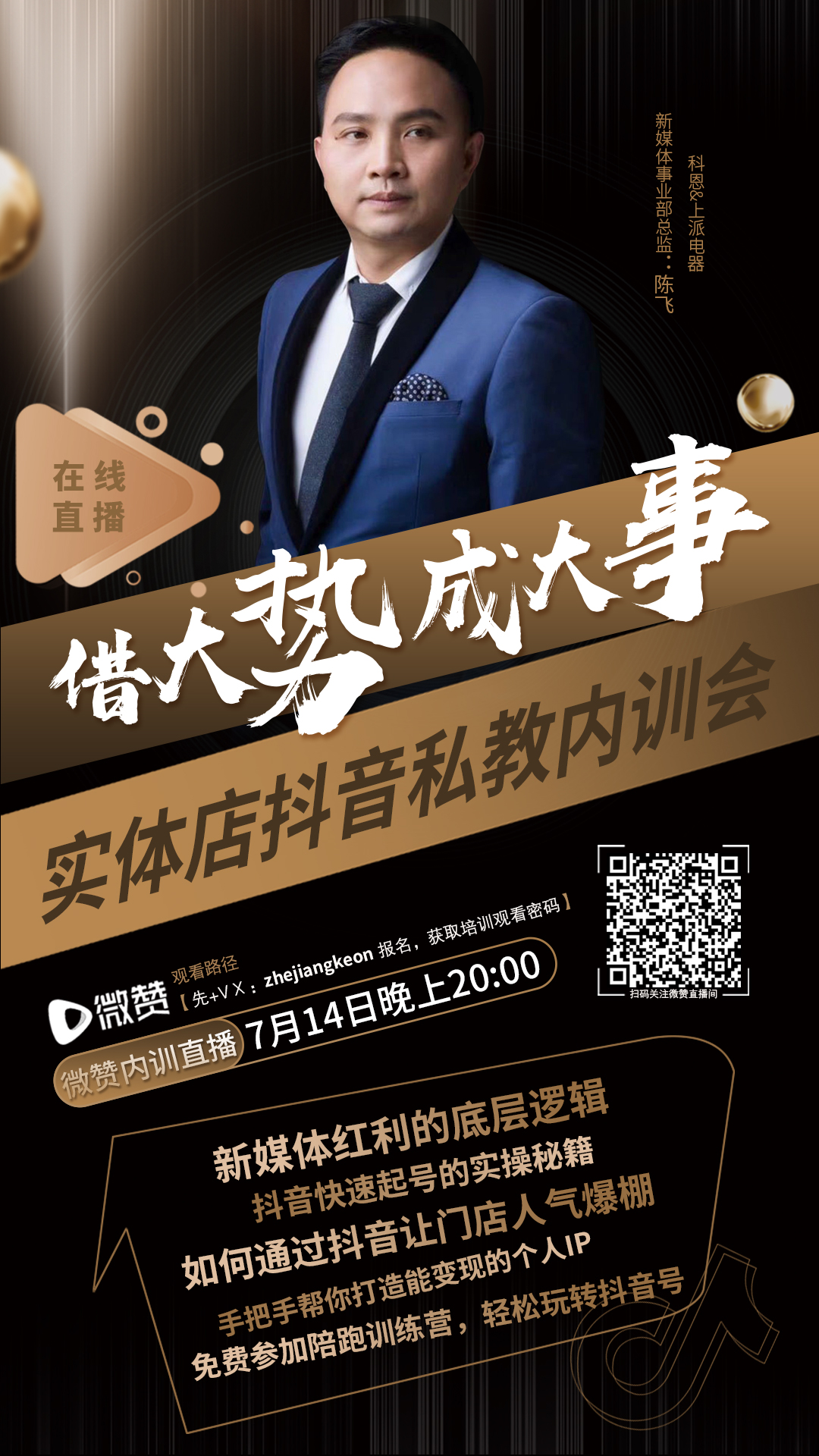 培訓時間:7月14日晚上8點,適合人群:實體店老板,你將得到:新媒體紅利的底層邏輯、抖音快速起號的實操秘籍、如何通過抖音讓門店人氣爆棚、手把手幫你打造能變現的個人IP、免費參加陪跑訓練營,輕松玩轉抖音號!分享人:  抖音流量運營特級講師、科恩&上派新媒體事業部總監,觀看路徑:微信號zhejiangkeon報名,獲得免費內訓資格!
