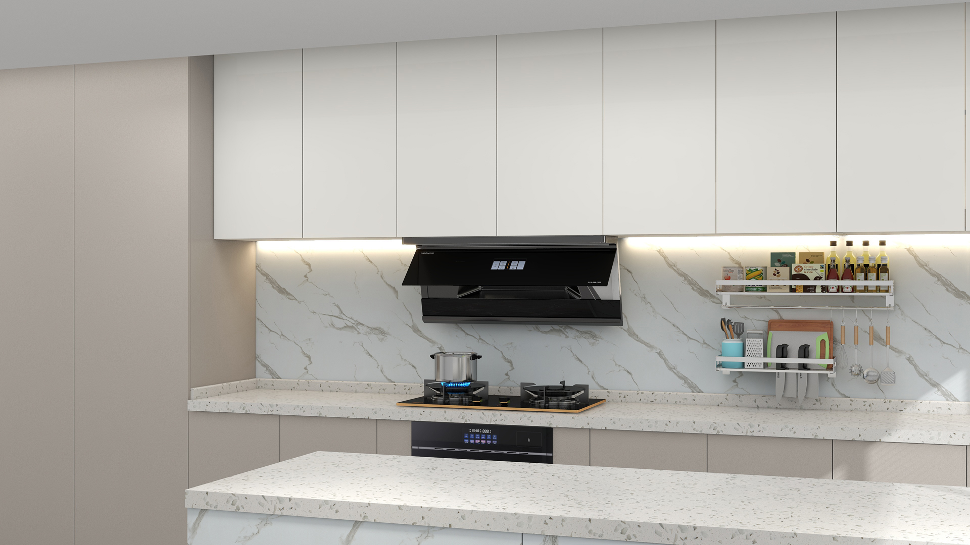 在設配性上,煙機7520突破傳統煙機安裝局限,采用365mm 小圍板結構,能夠完美適配多種尺寸的櫥柜。兼顧美學與實用性,全黑玻璃面板采用一體化成型工藝,不僅視覺上時尚大氣,適配現代簡約、輕奢等多種廚房裝修風格,且表面光滑易清潔,有效降低日常維護難度。操作層面,模塊化觸摸鍵布局清晰,功能標識直觀,搭配揮手智控技術,無需觸碰面板即可完成風量調節等操作,既便捷又衛生,滿足了不同年齡段用戶的使用需求。