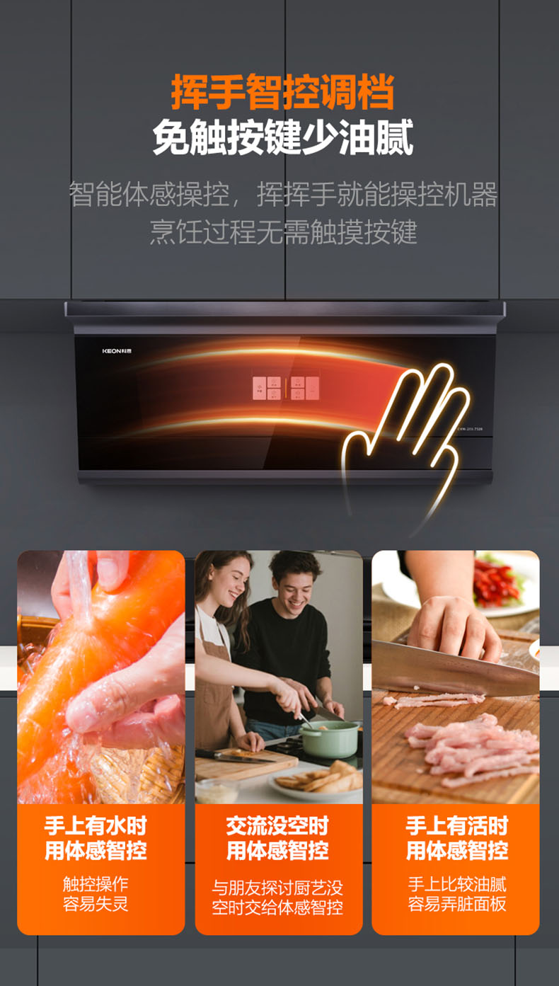 - 揮手智控,零觸碰調節操作面板,讓油污不沾手